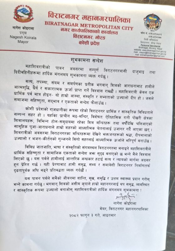 विराटनगर । विराटनगर महानगरपालिकाका मेयर नागेश कोइरालाले महाशिवरात्रिको अवसरमा महानगरवासीमा शुभकामना व्यक्त गर्दै समृद्ध र एकतामूलक सहर निर्माणका लागि सामूहिक प्रतिबद्धता आवश्यक रहेको बताएका छन् ।