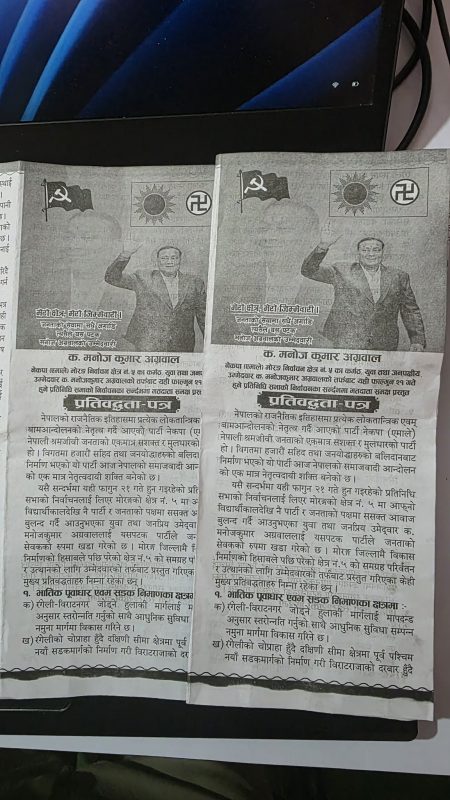 विराटनगर । आगामी फागुन २१ गते हुन लागेको प्रतिनिधीसभा सदस्यको लागि उम्मेदवारहरुले अहिले आ आफ्नो प्रतिबद्धता पत्र सार्वजनिक गर्ने कार्य एकपछि अर्को गर्दै आईरहेका छन् । यसैक्रममा मोरङ निर्वाचन क्षेत्र नम्बर ५ का उम्मेदवार मनोज कुमार अग्रवालले पनि आफ्नो मतदाताहरुलाई विस्वास दिलाउन त्यसक्षेत्रका समस्याहरुलाई उठान गर्दै सोमबार आफ्नो प्रतिबद्धतापत्र सार्वजनिक गरेका छन् । उनी नेकपा (एमाले) का तर्फबाट मोरङ निर्वाचन क्षेत्र नम्बर ५ बाट प्रतिनिधिसभा सदस्यका उम्मेदवार बनेका हुन् ।