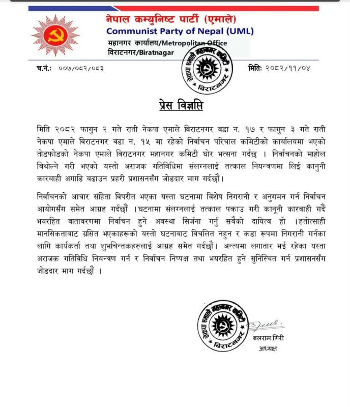 फागुन २ गते राती विराटनगर १७ र फागुन ३ गते राती विराटनगर १५ मा रहेको निर्वाचन परिचालन कमिटीको कार्यालयमा तोडफोड भएको महानगर अध्यक्ष बलराम गिरीले जानकारी दिए । महानगर कमिटिको विज्ञप्तिमा भनिएको छ,‘ निर्वाचनको माहोल विथोल्ने गरि भएका अराजक गतिविधिमा संलग्नलाई तत्काल नियन्त्रणमा लिई कानुनी कारवाही गर्न जोडदार माग गर्दछौं ।’
