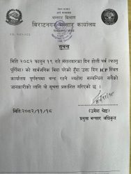 विराटनगर भन्सार कार्यालयद्वारा जारी सूचनाअनुसार २०८२ साल फागुन १९ गते मंगलबार परेको सार्वजनिक बिदाका दिन आईसीपीस्थित कार्यालय पूर्ण रूपमा बन्द रहने जनाइएको छ। प्रमुख भन्सार अधिकृत उमेश श्रेष्ठद्वारा सुचनामा होलिका दिन कार्यालय बन्द रहने उल्लेख गरिएको हो ।