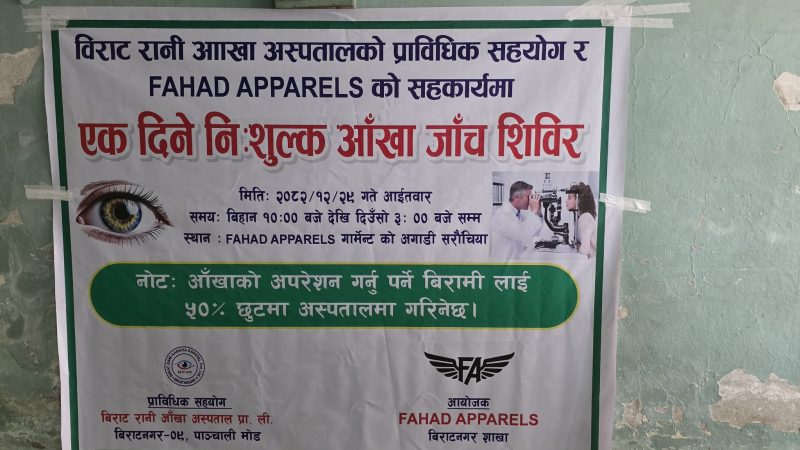 विराटनगर । विराटनगर–६ मा अवस्थित फहद एप्रिल्स गार्मेन्टमा कार्यरत मजदुरहरूका लागि निशुल्क आँखा जाँच शिविर सञ्चालन गरिएको छ । विराट रानी आँखा अस्पतालको प्राविधिक सहयोगमा एकदिने उक्त शिविरमा गार्मेन्टमा कार्यरत १८० जना महिला तथा पुरुष मजदुरहरूको आँखा परीक्षण गरिएको थियो।