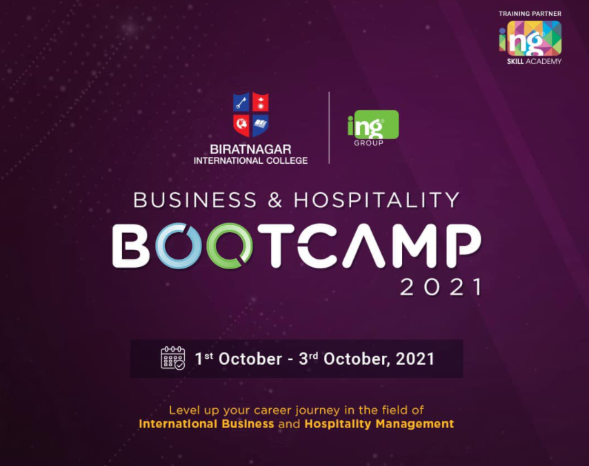 विराटनगर , असोज १४ बिराटनगर-६ स्थित बिराटनगर इन्टरनेसनल कलेजमा बिजनेस र हस्पिटालिटी बुटक्याम्प आयोजना हुने भएको छ । बेलायतको युनिभर्सिटी अफ वल्भरह्याम्टनसंगको साझेदारीमा संचालित उक्त कलेजले प्लस २ पढिरहेका बिद्यार्थीहरुको लागि उक्त बुटक्याम्प आयोजना गर्न लागेको हो । बुट क्याममा बिराटनगरका बिभ. . .