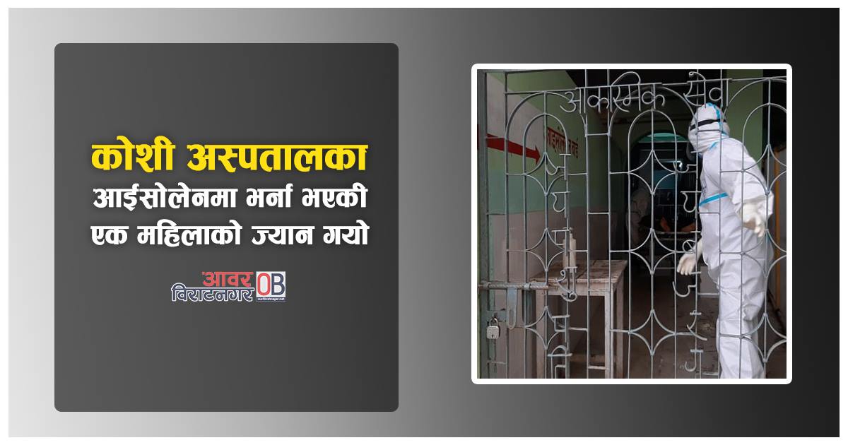 विराटनगर । कोशी अस्पताल विराटनगरमा भर्ना भएकी एक महिलाको आईसोलेसन वार्डमा मृत्यु भएको छ । सुनसरीको इनरुबाट बिहीबार अस्पताल ल्याएर भर्ना गरिएकी ४० बर्षीया जंगलीदेवी सरदारको कोशी अस्पतालकै आइसोलेशनमा मृत्यु भएको हो । मृतक सरदारको कोरानाको लक्षण देखिएपछि कोशीको आईसोलेसनमा भर्ना गरिएको मेडिकल सुपर�. . .