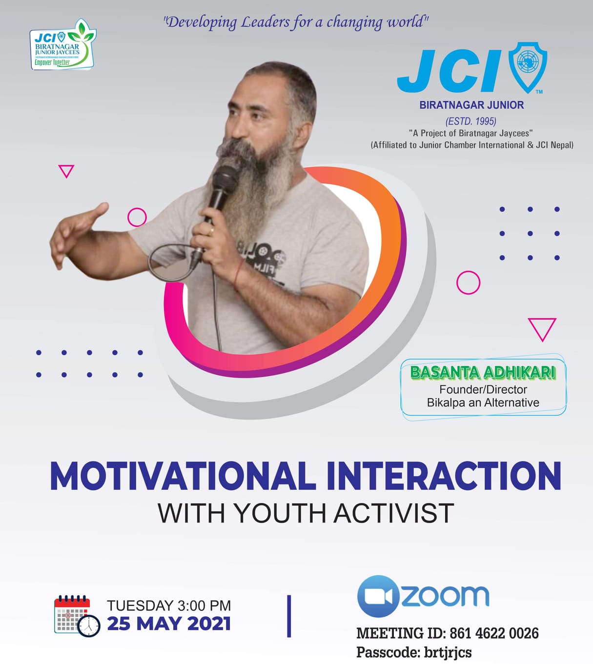विराटनगर । विराटनगर जुनियर जेसिजले जेसिज अभियानकर्मीलाई उत्प्रेरणामुलक अन्र्तक्रिया सम्पन्न गरेको छ । अनलाईन मार्फत मंगलबार गरिएको अन्र्तक्रियाको प्रमुख वक्तामा विकल्प एन अल्टरनेटिभका संस्थापक निर्देशक वसन्त अधिकारी रहनु भएको थियो । सो कार्यक्रममा विराटनगर जुनियर जेसिजका संस्थापक अध्यक्ष डा. . .