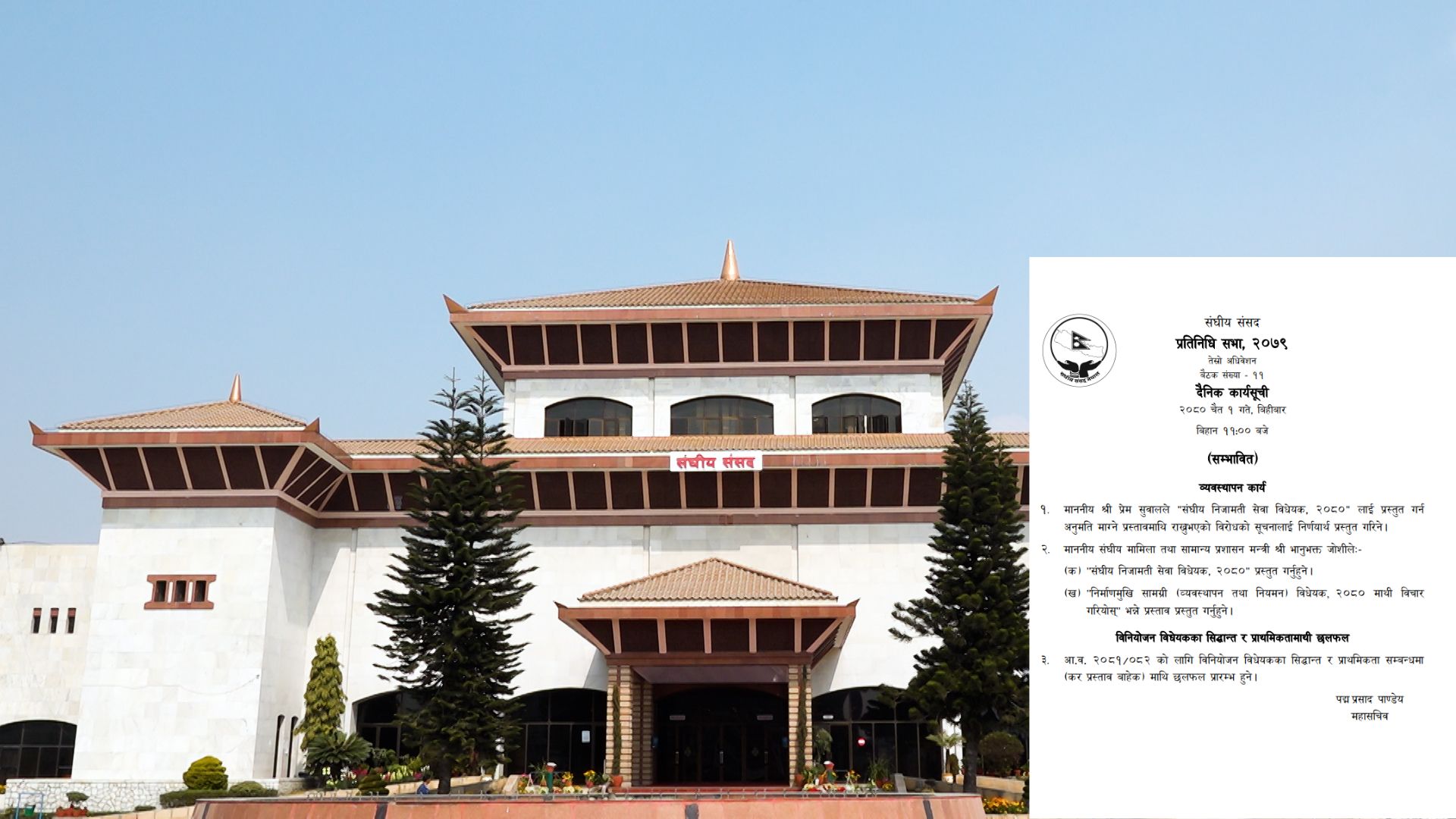 काठमाडौं । संघीय संसदको प्रतिनिधि सभाको बैठक आज बस्दै छ । बैठक बिहीबार बिहान ११ बजे शुरु हुने छ । नयाँ बानेश्वरस्थित संघीय संसद भवनमा शून्य र विषेश समयमा सांसदहरुलाई बोल्न दिइने छ । साथै बैठकमा नेपाल मजदुर किसान पार्टीका सांसद प्रेम सुवालले “संघीय निजामती सेवा विधेयक, २०८०“ लाई प्रस्तुत गर्न अनुमति �. . .