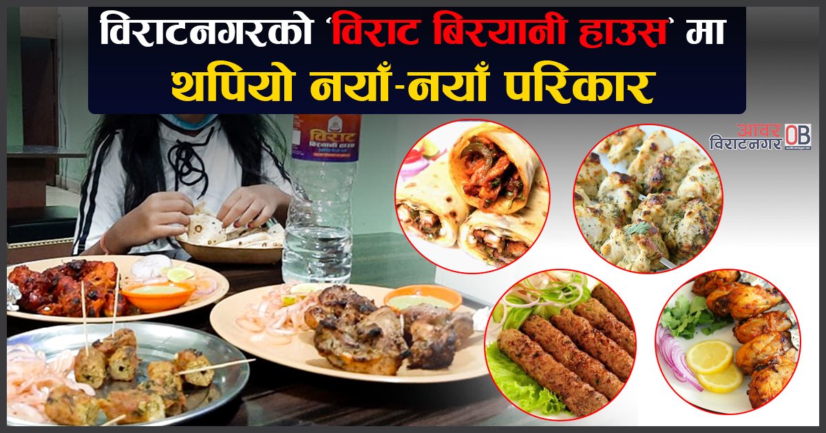 विराटनगर । विराटनगर ९ रंगेली रोड ग्रिनक्रस हस्पिटल छेउ रहेको ‘बिराट ब्रियानी हाउस’ले नयाँ नयाँ परिकार थपेको छ । यस अघि चिकेन,मटन र भेज ब्रियानी ईस्पेसल रुपमा बनाउदै आएकोमा बुधबारबाट ग्राहकहरुको माग अनुसारका नयाँ नयाँ परिकार बनाउन थालेको हो । मोरङको सुनवर्सी नगरपालीका ६ का ३० बर्षिय मो.आफताव आलमले गत . . .