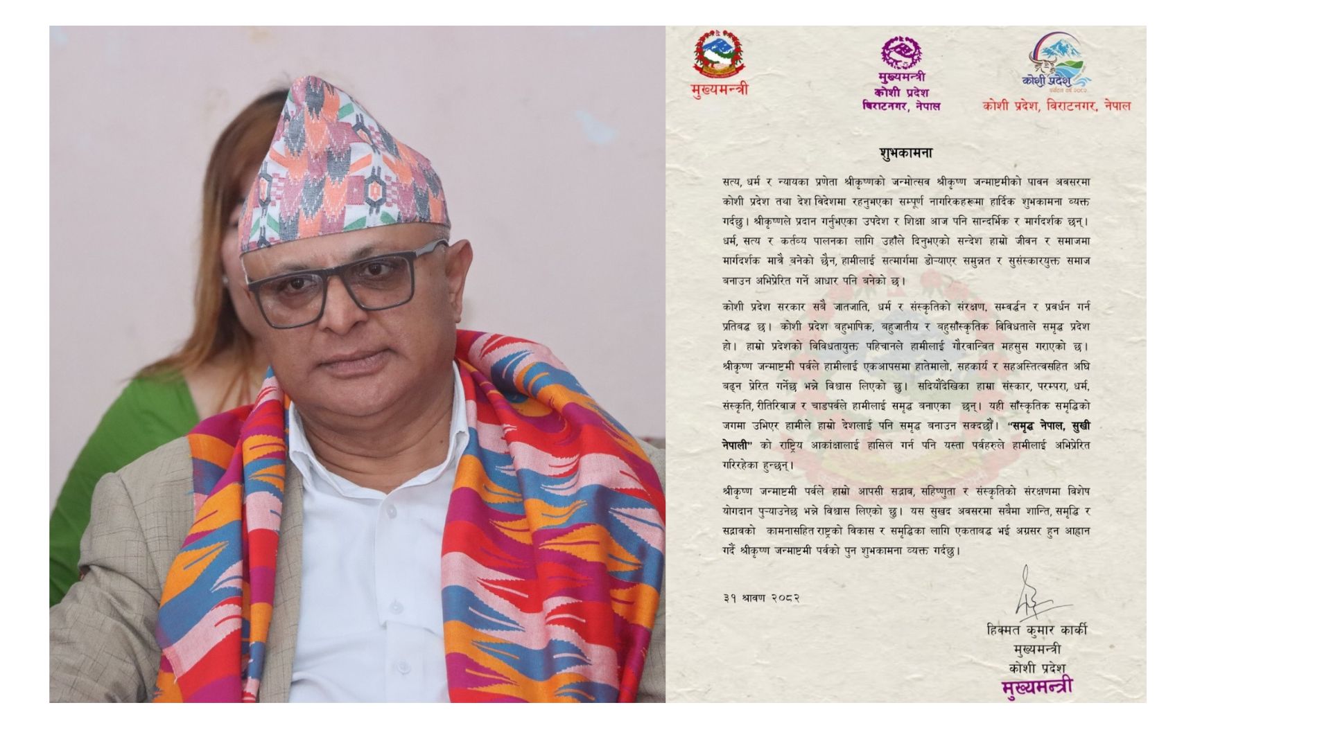 कोशीका मुख्यमन्त्री कार्कीबाट श्रीकृष्ण जन्माष्टमीको शुभकामना