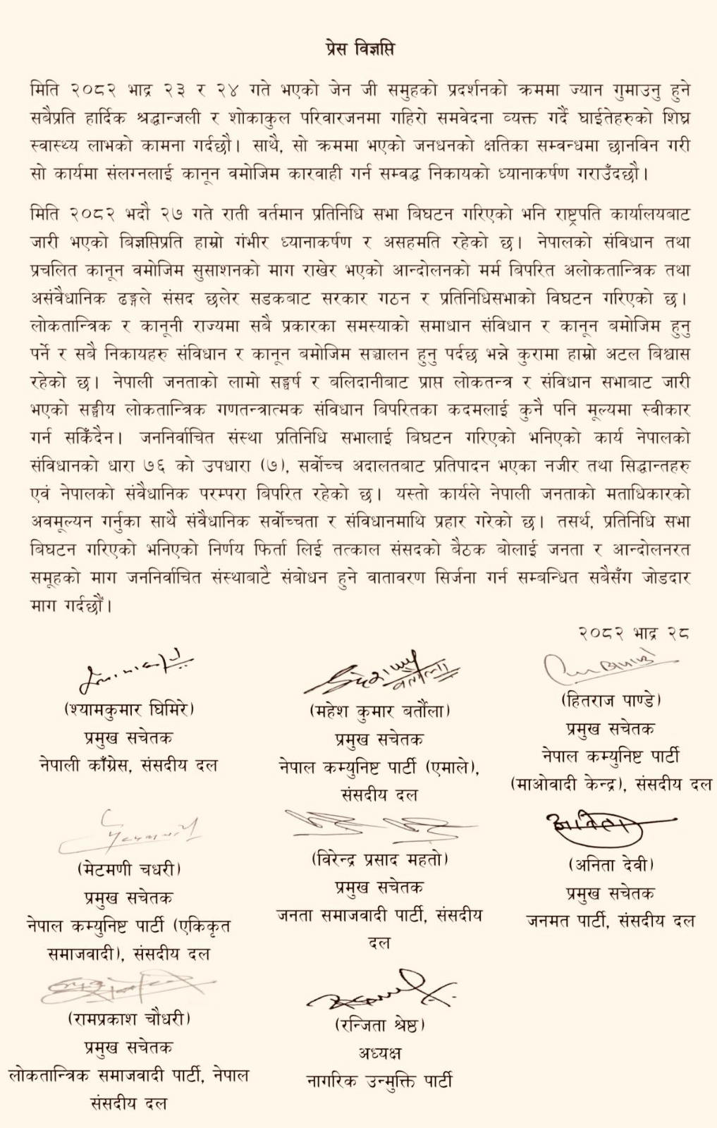 काठमाडौं । भदौ २७ गते राति वर्तमान प्रतिनिधि सभा विघटन गरिएको भनि राष्ट्रपति कार्यालयबाट जारी भएको विज्ञप्तिप्रति आठवटा राजनीतिक दलहरुले गम्भीर ध्यानाकर्षण र असहमति प्रकट गरेका छन् । शनिबार एक संयुक्त प्रेस विज्ञप्ति जारी गर्दै नेपाली काँग्रेस, नेपाल कम्युनिष्ट पार्टी (एमाले), नेपाल कम्युनिष्ट पार. . .
