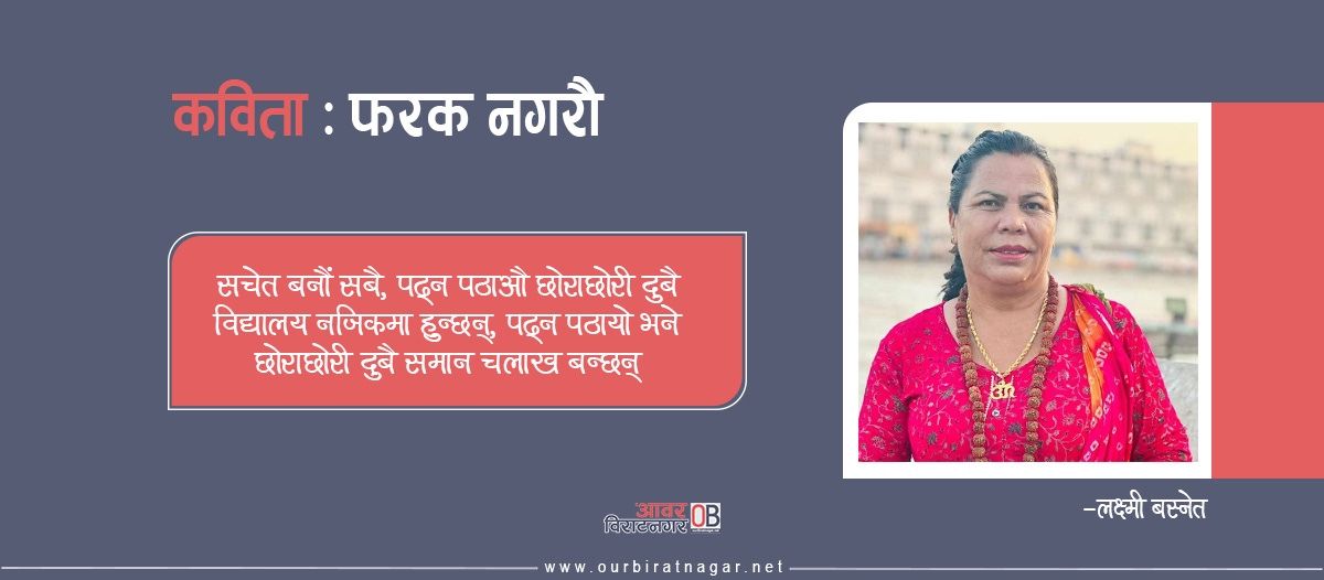 -टिङ्कु भट्टराई ' निर्झरी ' अलिअलि देखिएर खुल्दै खुल्दै निस्क कोपिलाको हाँसो जस्तो फुल्दैफुल्दै निस्क सिर कोल्टे बनाएर हेर,लोचन तन्काएर केशराशि भित्र बाट झुल्दैझुल्दै निस्क आहा!लजाएको मुहार छोपी देखाउन्न भनी लौ,यो अनौठो मोहनीमा भुल्दै भुल्दै निस्क म नि आउँला केही काम भए जस्तो गरी तिमी त्यस. . .