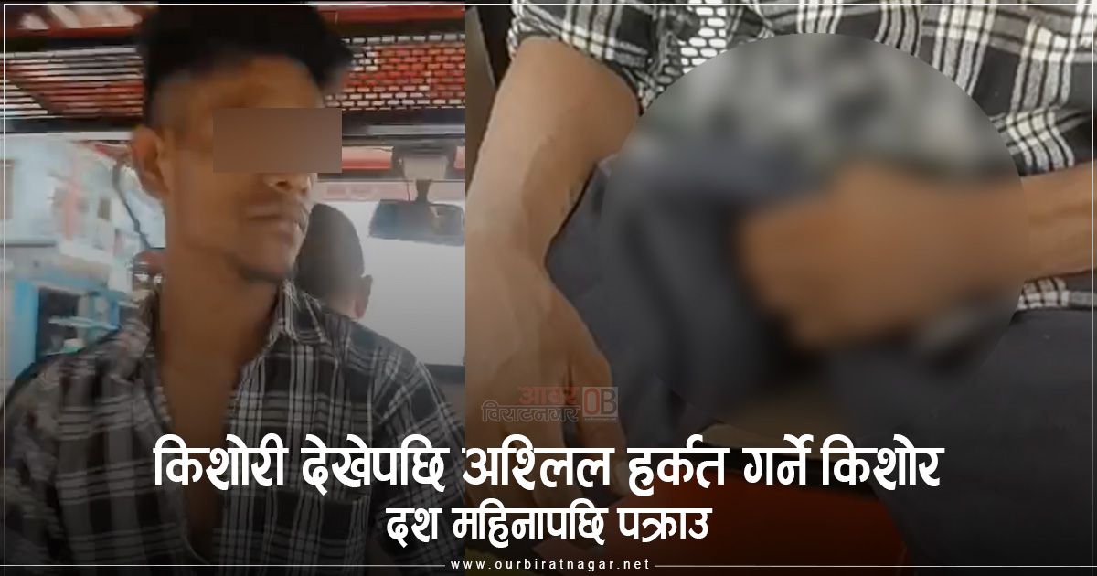 इन्दु साह विराटनगर । दश महिना अगाडी गत भदौ ११ गते विराटनगरका निकालिने रथयात्राको दिन सिटी सफारीमा दुई किशोरीलाई लक्षित गर्दै यौनजन्य अश्लिल गतिविधि गर्ने युवा उस्तै प्रकृतिको गतिविधि दोहोरियाएको आरोपमा पक्राउ परेका छन् । बिहीबार साँझ विराटनगर–३ को एक होटल बाहिर उनले किशोरीहरुलाई लक्षित गर्दै अश्ल. . .