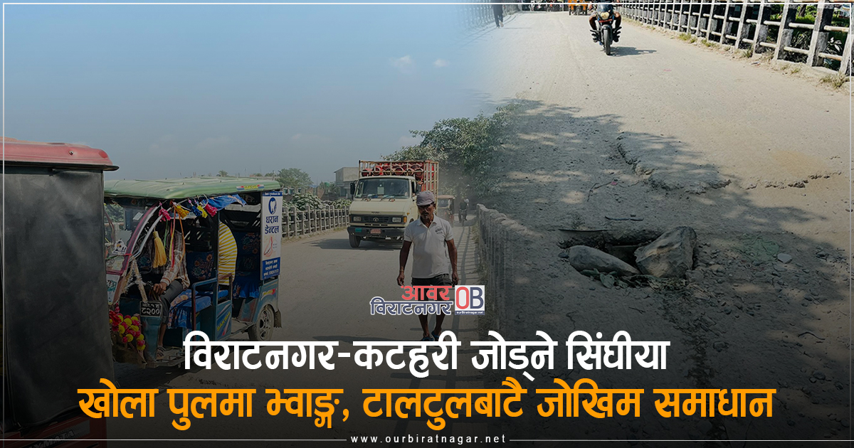 विराटनगर । विराटनगर महानगरपालिका र कटहरी गाउँपालिका जोड्ने सिंघीय खोलाको पुलमा भ्वाङ्ग परेको छ । हुलाकी राजमार्ग अन्तर्गत विराटनगर–७ र ८ वडा तथा कटहरी गाउँपालिका–१ र २ लाई जोडेको पुलमा भ्वाङ्ग परेको हो । विराटनगरमा उत्तरतफ विराटनगर ७ र दक्षिणतर्पm ८ नम्बर वडा र कटहरीको उत्तरतर्फ १ र दक्षिणतर्फ २ नम्�. . .