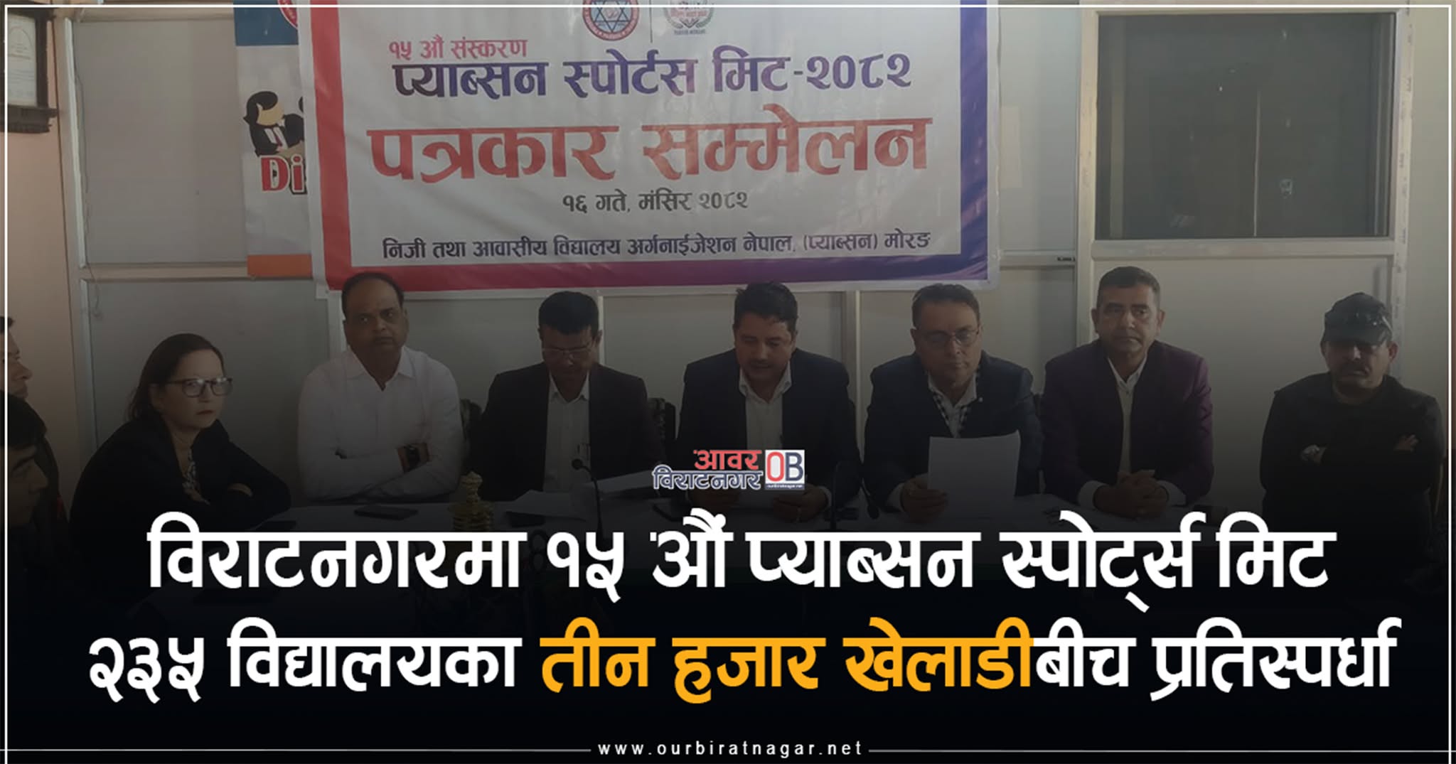 विराटनगर । निजी तथा आवासीय विद्यालय अर्गनाइजेसन नेपाल (प्याब्सन) मोरङको आयोजनामा विराटनगरमा ‘१५औं प्याब्सन स्पोट्र्स मिट–२०८२’ भव्य रूपमा सञ्चालन हुने भएको छ । प्याब्सन मोरङले मंगलबार विराटनगरमा पत्रकार सम्मेलनको आयोजना गरी स्पोट्र्स मिटको तयारीबारे जानकारी गराएको हो । प्याब्सन मोरङका अध्यक्ष . . .