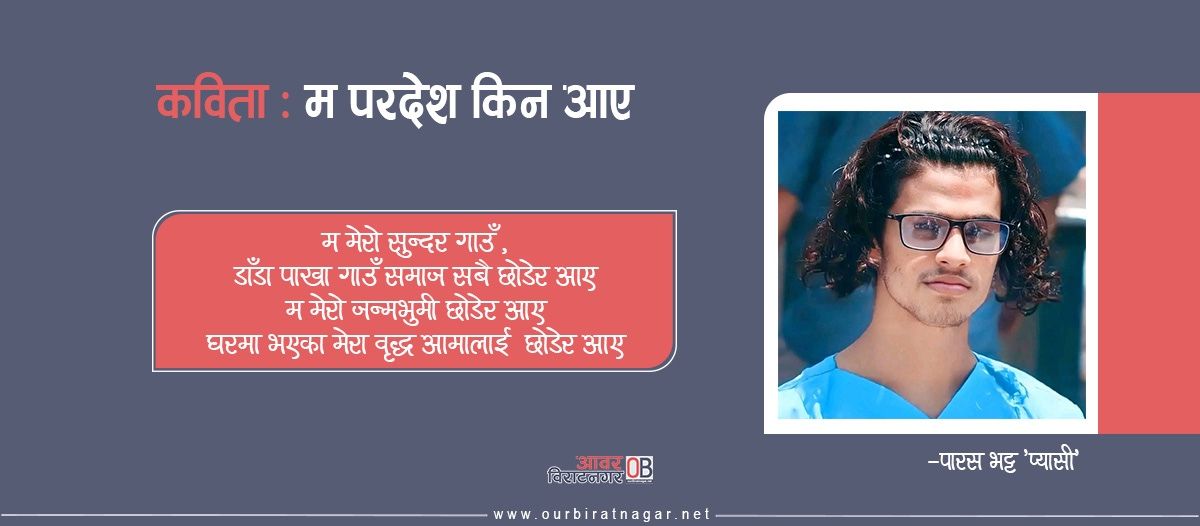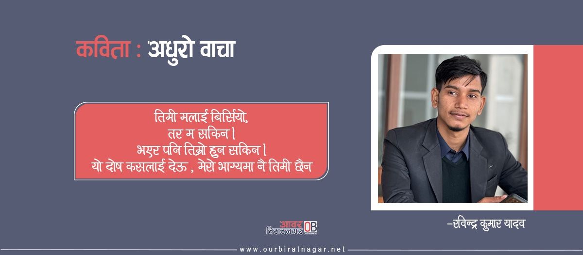 -रविन्द्र कुमार यादव तिमी मलाई बिर्सियो, तर म सकिन । भएर पनि तिम्रो हुन सकिन । यो दोष कसलाई देऊ , मेरो भाग्यमा नै तिमी छैन, कि मेरो नहुनुमा तिम्रो पनि दोष छ। आज त्यो हजारौको भीडमा मेरो आँखा तिमीलाई खोज्छ । निदाउँदा पनि सपनामा तिमीलाई देख्छ । साच्चिकै यही माया हो , तिम्रो जीवनमा मेरो उपस्थितिले नयाँ त्र�. . .