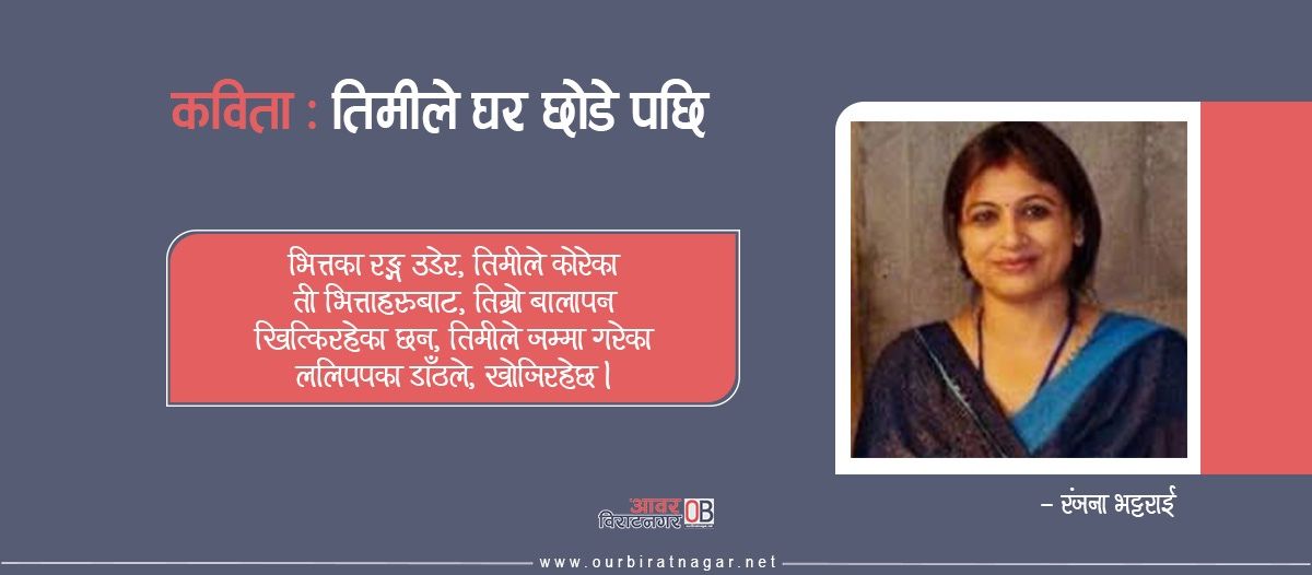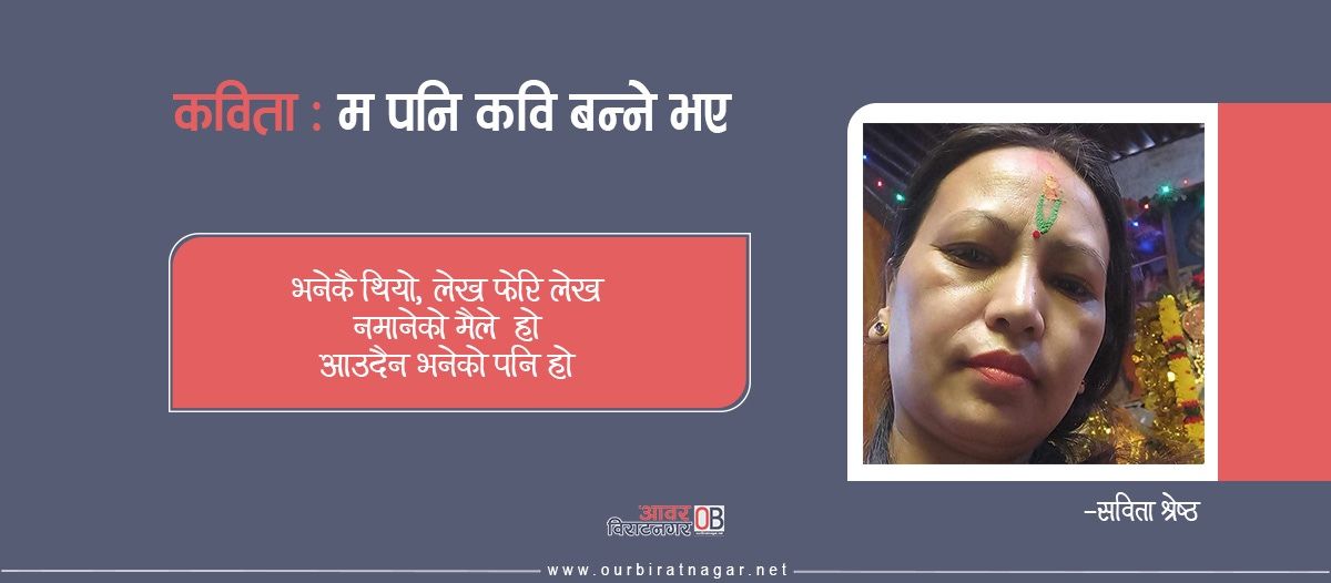 -रंजना भट्टराई भावनामा बगेर भाव कै समुन्द्रमा डुबुल्की मार्ने म कवि । मरभुमिमा हरियालि देख्ने मृग तृष्णाका क्षण पानीमा डुबुल्की मार्ने म कवि म फूलमा सुन्दर जीवन देख्छु तिमी त्यसमा बास्ना छ भन्छौ त्यसमा कोपिला, पराग अनि रङ्ग पनि त हुन्छ । नीलो आकाश, श्वेत हिमाल क्षितिजको सामिप्यमा उदाएको सूर्. . .