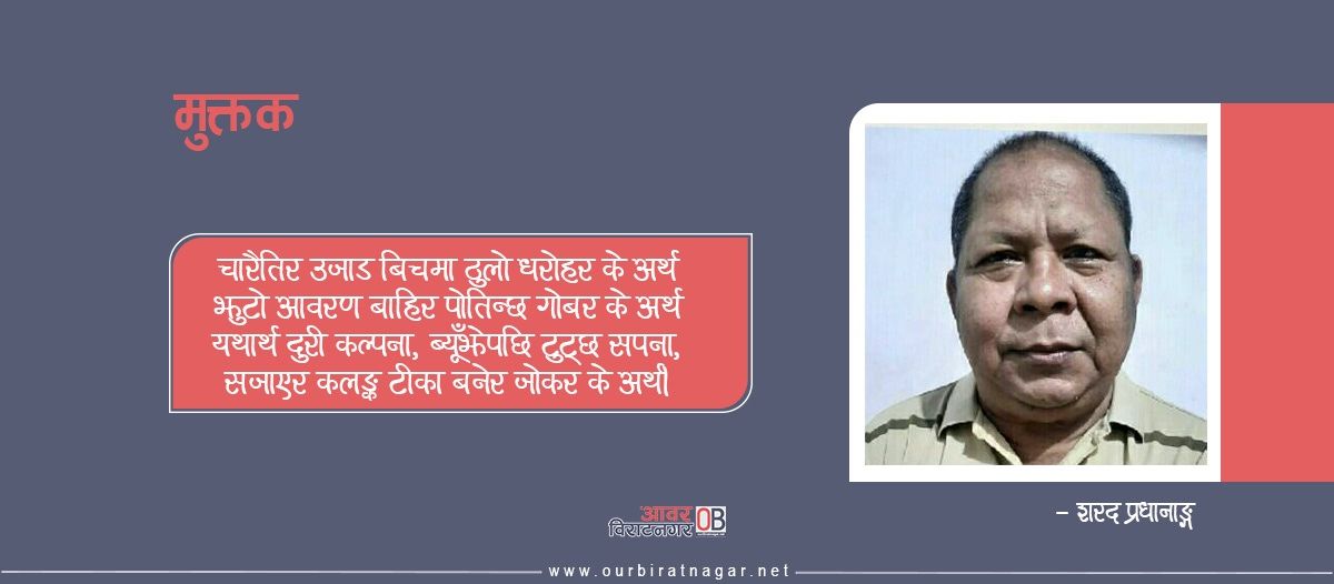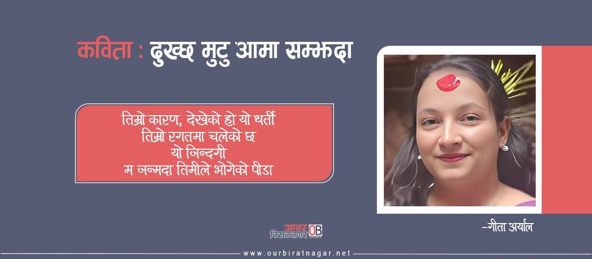 -शुद्ध लक्ष्मी श्रेष्ठ न रोगले छेक्ने न शोकले रोक्ने मनभरी पीडा बोकेर तन भरी ब्यथाको भारी उचालेर लम्कनै पर्ने जीवन यात्रामा । आकाश खस्छु भनेपनि पहाड भत्कन्छु भनेपनि नदी रोकिन्छु भनेपनी आफ्ना कथा आफ्ना ब्यथा आफै बोकेर हिंड्नै पर्ने जीवन यात्रामा । ग्रह गति लागेपनि भूकम्प ज्वालामूखी आएपनि आगो . . .