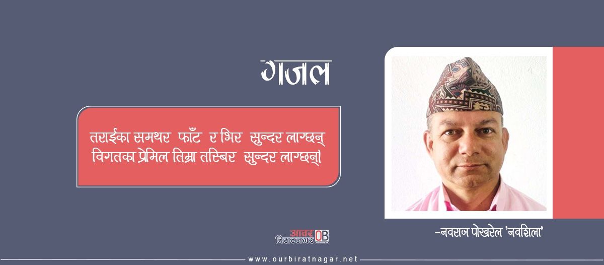 -नवराज पोखरेल 'नवशिला' तराईका समथर फाँट र भिर सुन्दर लाग्छन् विगतका प्रेमिल तिम्रा तस्बिर सुन्दर लाग्छन्। जिजस,अल्लाह,शिव रव यिनका नाम फरक, मस्जिद चैत्य चर्च गुम्बा मन्दिर सुन्दर लाग्छन्। हरदम हरक्षण माताजीको मुहार हेरिरहन्छु, हेर्दै जाँदा ती अनुहारका पिर सुन्दर लाग्छन्। पीर अभावमा जिउने बा�. . .