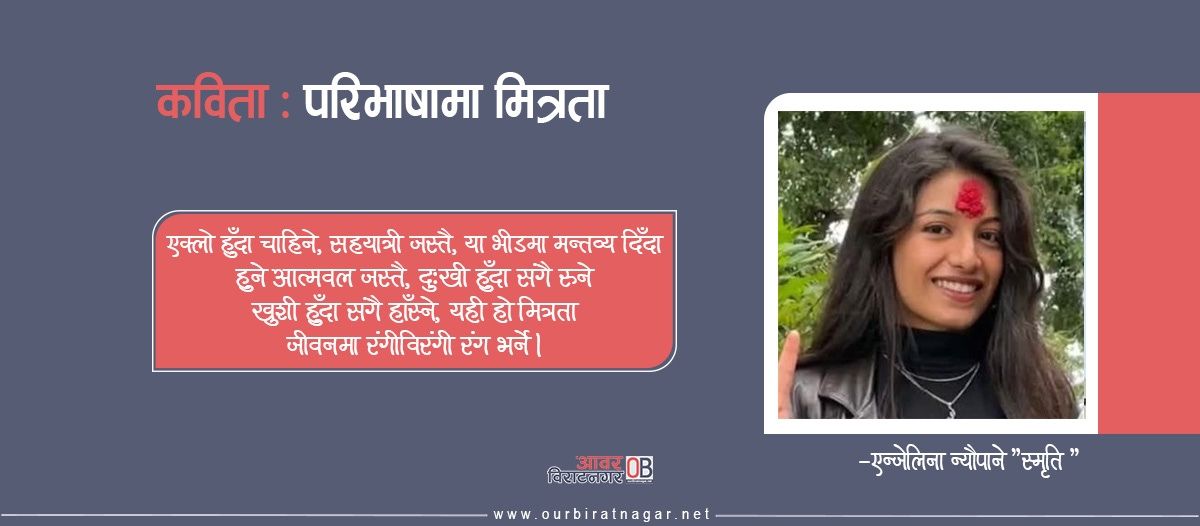 -एन्जेलिना न्यौपाने "स्मृति " एक्लो हुँदा चाहिने सहयात्री जस्तै या भीडमा मन्तव्य दिँदा हुने आत्मवल जस्तै दुःखी हुँदा संगै रुने खुशी हुँदा संगै हाँस्ने यही हो मित्रता जीवनमा रंगीविरंगी रंग भर्ने । फूले झै काँडाका बीचमा गुलाफ हो मित्रता हाँसे झै ताराका वीचमा चन्द्रमा मुसुक्क हो मित्रता नक्कली र झु�. . .