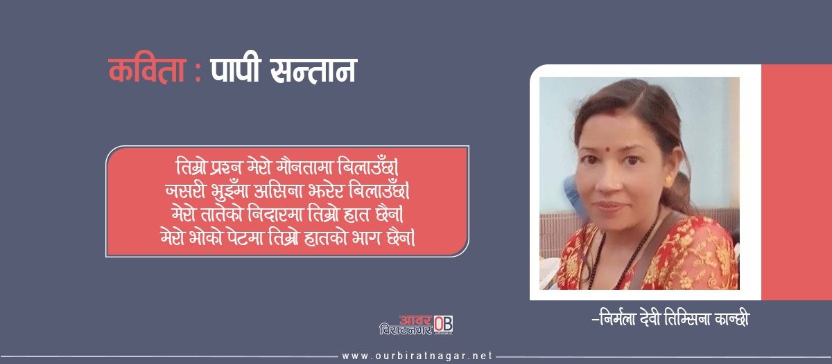 - निर्मला देवी तिम्सिना 'कान्छी' बादल ठुस्किएपछि पानी पर्छ। शरीर तातेपछि पसिना झर्छ। मन दुखेपछि आँसु झर्छ। चोट लागेपछि रगत बग्छ। तिम्रो शरीर चिर्दै निस्किएकी म, कति रगत बग्यो थाहा छैन ! तिमी हाँस्न सक्यौ या सकेनौ रोयौ, चिच्यायौ ,करायौ या मौन रह्यौ तिमी समुद्र बन्यौ या खहरे! थाहा भएन तर म रुँदा तिमी र�. . .