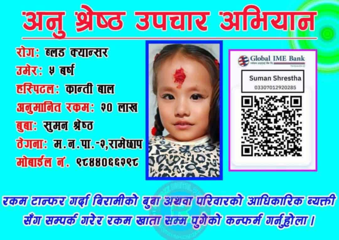 विराटनगर । पाँचवर्षकी छोरीलाई ब्लड क्यान्सर भएपछि कान्ति बाल अस्पतालमा भर्ना गरेर उपचारका लागि आमा–बाबु बसेका छन् । तर, गत चैतमा टिचिङ अस्पताल काठमाण्डौंमा भर्ना गरेदेखि यता छोरीलाई घर फर्काउन सकिरहेका छैनन् । छोरीलाई पाँचवर्षमै ब्लड क्यान्सर भएको थाहा पाएपछि रामेछाप मन्थली नगरपालिका–२ का सुमन श�. . .