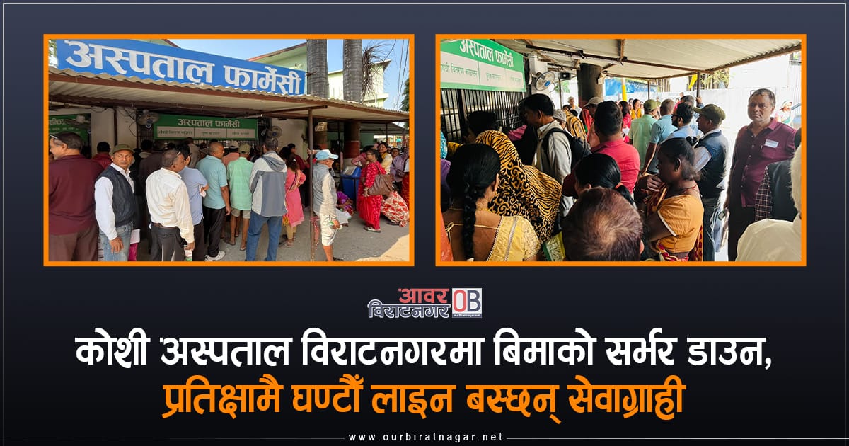 सोनु साह विराटनगर । कोशी अस्पताल विराटनगरमा बिमाको सर्भर बारम्बार डाउन हुने समस्याले विरामी र उनीहरूका आफन्तहरू घण्टौँ लाइनमा पर्खिन बाध्य भएका छन् । अस्पतालमा औषधी लिनेदेखि सामान्य चेकजाँच गर्न समेत घण्टौँ समय लाग्ने गरेको सेवाग्राहीको गुनासो छ । सेवाग्राहीको भनाइअनुसार बिहान ८ बजेदेखि लाइनमा �. . .
