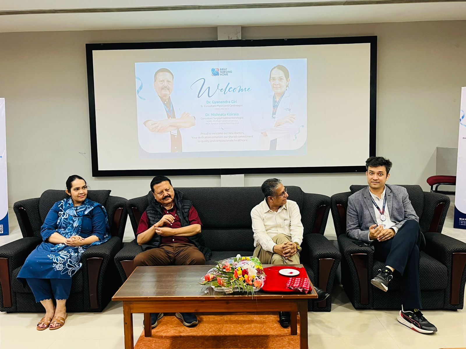 विराटनगर । बिराट नर्सिङ होम प्रा.लि.ले हालै नियुक्त भएका दुई कन्सल्टेन्ट चिकित्सकको सम्मान तथा परिचयका लागि विशेष स्वागत कार्यक्रम आयोजना गरेको छ। आइतबार, मंसिर ७ गते अस्पतालकै सम्मेलन हलमा सम्पन्न कार्यक्रममा विविध विभागका कर्मचारीहरूले सहभागिताजन्य उपस्थिति जनाएका थिए। कार्यक्रममार्फत स्व. . .