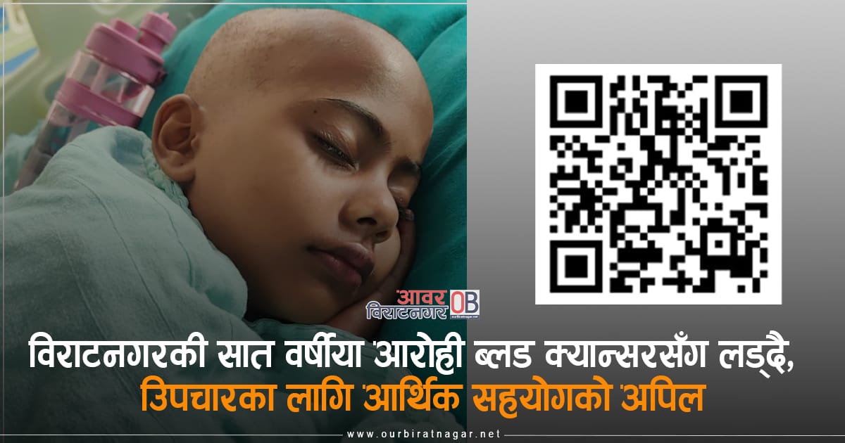 विराटनगर । विराटनगर–४ निवासी मनिकलाल गोसाई की ७ वर्षीया छोरी आरोही गोसाई विगत तीन महिनादेखि क्यान्सरबाट ज्यान बचाउने संघर्ष गरिरहेकी छिन्। चितवनस्थित बीपी कोइराला मेमोरियल क्यान्सर अस्पतालमा उपचाररत आरोहीलाई ब्लड क्यान्सर (ल्यूकिमिया) भएको चिकित्सकहरूले पुष्टि गरेका छन्। स्वास्थ्यकर्मीका अनुस. . .