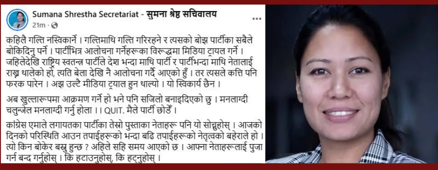 काठमाडौं । राष्ट्रिय स्वतन्त्र पार्टी (रास्वपा) कि नेतृ सुमना श्रेष्ठले पार्टी परित्याग गरेको घोषणा गरेकी छिन् । आइतबार सामाजिक सञ्जालमार्फत उनले पार्टी त्याग गरेको घोषणा गरेकी हुन् । उनले कहिलै गल्ति नस्वीकार्ने , गल्तिमाथि गल्ति गरिरहने र त्यसको बोझ पार्टीका सबैले बोकिदिनु पर्ने भन्दै प्रश्न समे. . .
