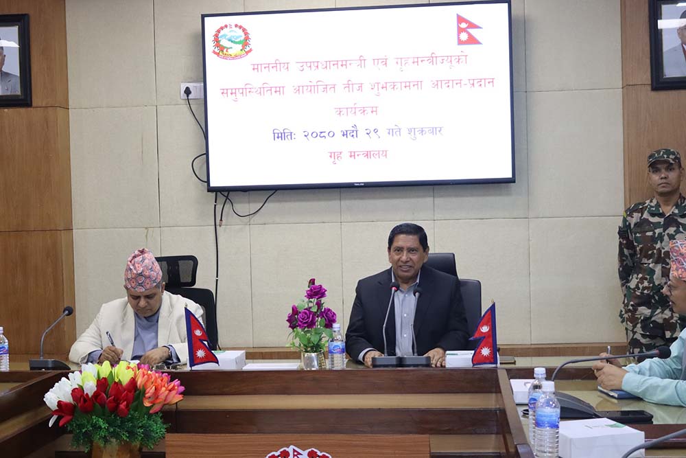 काठमाडौँ । उपप्रधानमन्त्री एवं गृहमन्त्री नारायणकाजी श्रेष्ठले तीज पर्वलाई पितृसत्तात्मक विकृतिबाट मुक्त गर्दै सांस्कृतिक उत्साह तथा उत्सवका रूपमा मनाउनुपर्ने बताउनुभएको छ । आज गृहमन्त्रालयमा आयोजित तीज शुभकामना आदानप्रदान कार्यक्रममा उहाँले पूर्वीय संस्कृतिमा मानव जीवनलाई सकारात्मक दिशा �. . .