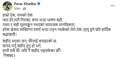काठमाडौं । नेपाल क्रिकेट संघ (क्यान) का सचिव तथा पूर्वराष्ट्रिय क्रिकेट कप्तान पारस खड्काले हरेक क्षेत्रमा व्यक्तिगत स्वार्थ भन्दा माथि उठ्न नसक्दा समस्या आउने गरेको औंल्याएका छन् । सोमबार सामाजिक सन्जालमा लेख्दै उनले जेनजी पुस्ताको प्रदर्शनका क्रममा मृत्यु भएकाहरुप्रति श्रद्धाञ्जली व्यक्त ग. . .