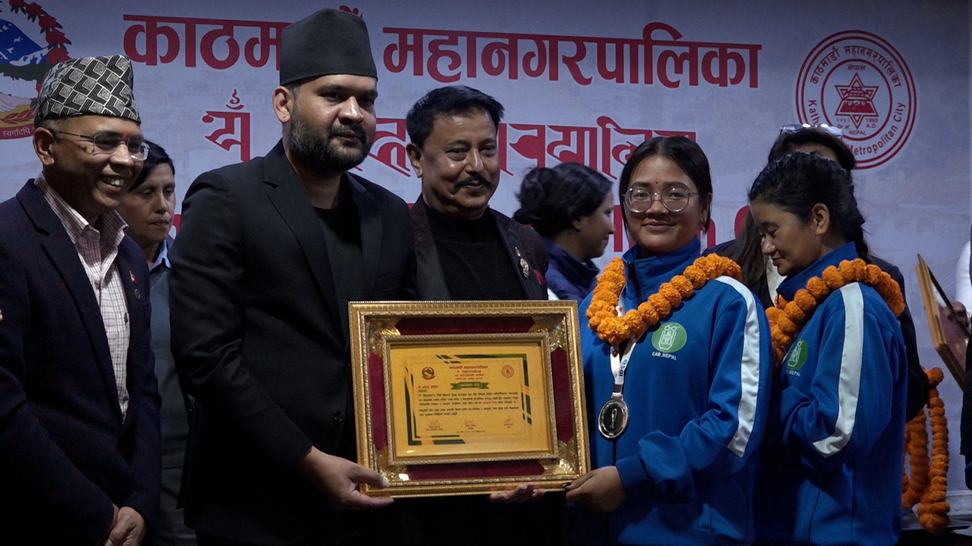 काठमाडौं । काठमाडौं महानगरपालिकाले राष्ट्रिय नेत्रहीन महिला क्रिकेट टोलीलाई सम्मान गरेको छ । आइतबार आयोजित विशेष समारोहमा टोलीलाई पहिलो महिला टि–२० दृष्टिविहीन विश्वकप क्रिकेट २०२५ मा उपविजेता बनेको अवसरमा सम्मान गरिएको हो । उक्त प्रतियोगिता कार्तिक २४ गतेदेखि मंसिर ७ गतेसम्म भारत र श्रीलंकामा आ. . .
