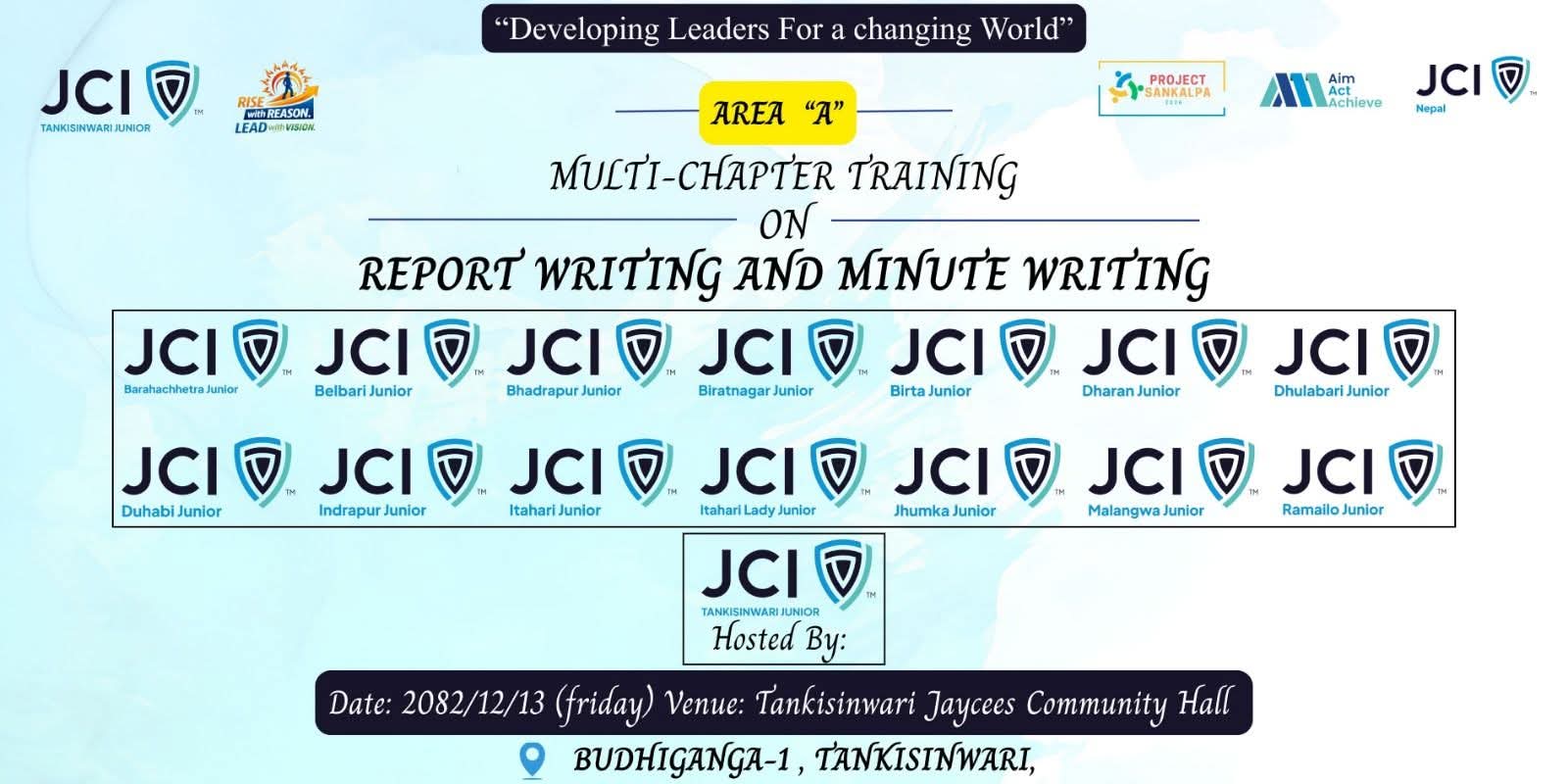 विराटनगर । मोरङको बुढिगंगा गाउँपालिका–१, टंकीसिनवारीमा रहेको टंकीसिनवारी जुनियर जेसिजद्वारा “एरिया ‘ए’ बहु–शाखा रिपोर्ट लेखन तथा बैठक मिनेट लेखन तालिम” कार्यक्रम आयोजना गरिने भएको छ। उक्त तालिम कार्यक्रम २०८२ चैत १३ गते बिहान ९:०० बजेदेखि साँझ ५:०० बजेसम्म टंकीसिनवारी जुनियर जेसिज हलमा सञ्चालन ह�. . .