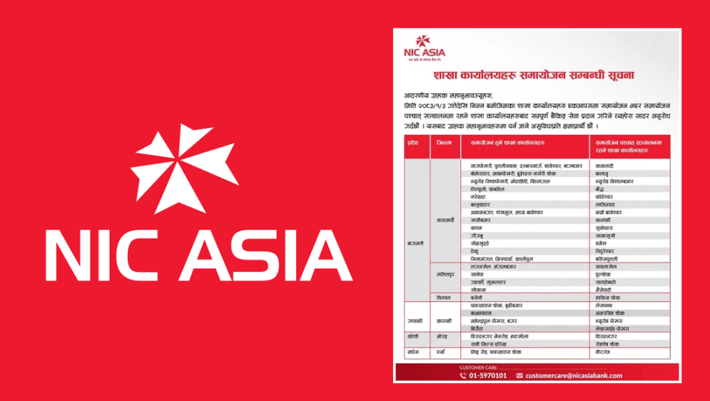 काठमाडौं । एनआईसी एशिया बैंकले देशभर आफ्ना विभिन्न ४२ वटा शाखा कार्यालयहरू समायोजन (मर्ज) गर्ने निर्णय गरेको छ । बैंकले जारी गरेको सूचनाअनुसार आजदेखि विभिन्न स्थानमा रहेका शाखाहरू एकआपसमा गाभिएर सेवा दिनेछन् । बैंकका अनुसार समायोजनपछि तोकिएका शाखा कार्यालयहरूबाटनै सम्पूर्ण बैंकिङ सेवा प्रदान ग�. . .