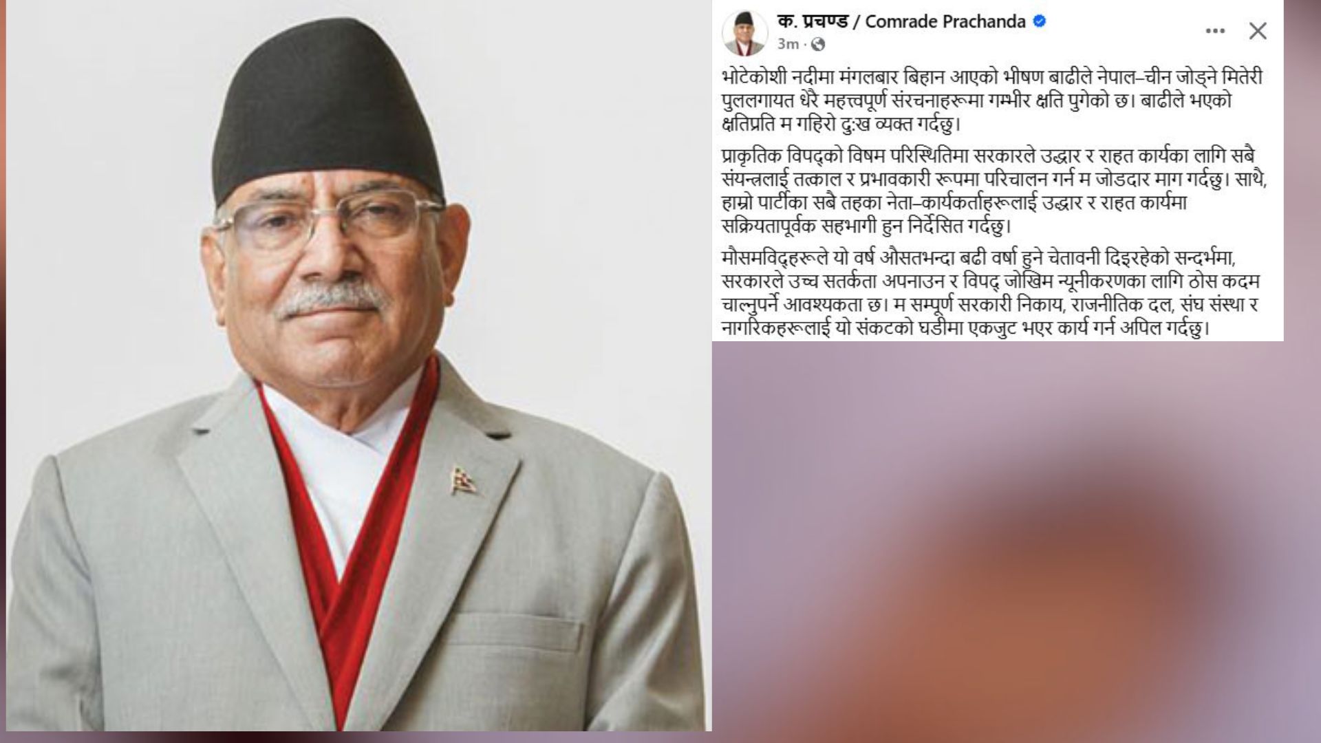 काठमाडौं । नेकपा माओवादी केन्द्रका अध्यक्ष पुष्पकमल दाहाल प्रचण्डले भोटेकोशी नदीमा मंगलबार बिहान आएको भीषण बाढीले नेपाल–चीन जोड्ने मितेरी पुललगायत धेरै महत्त्वपूर्ण संरचनाहरूमा भएको क्षतिप्रति दुःख व्यक्त गरेका छन् । सामाजिक सञ्जाल फेसबुकमा लेख्दै उनले बाढीले भएको क्षतिप्रति गहिरो दुःख व्. . .