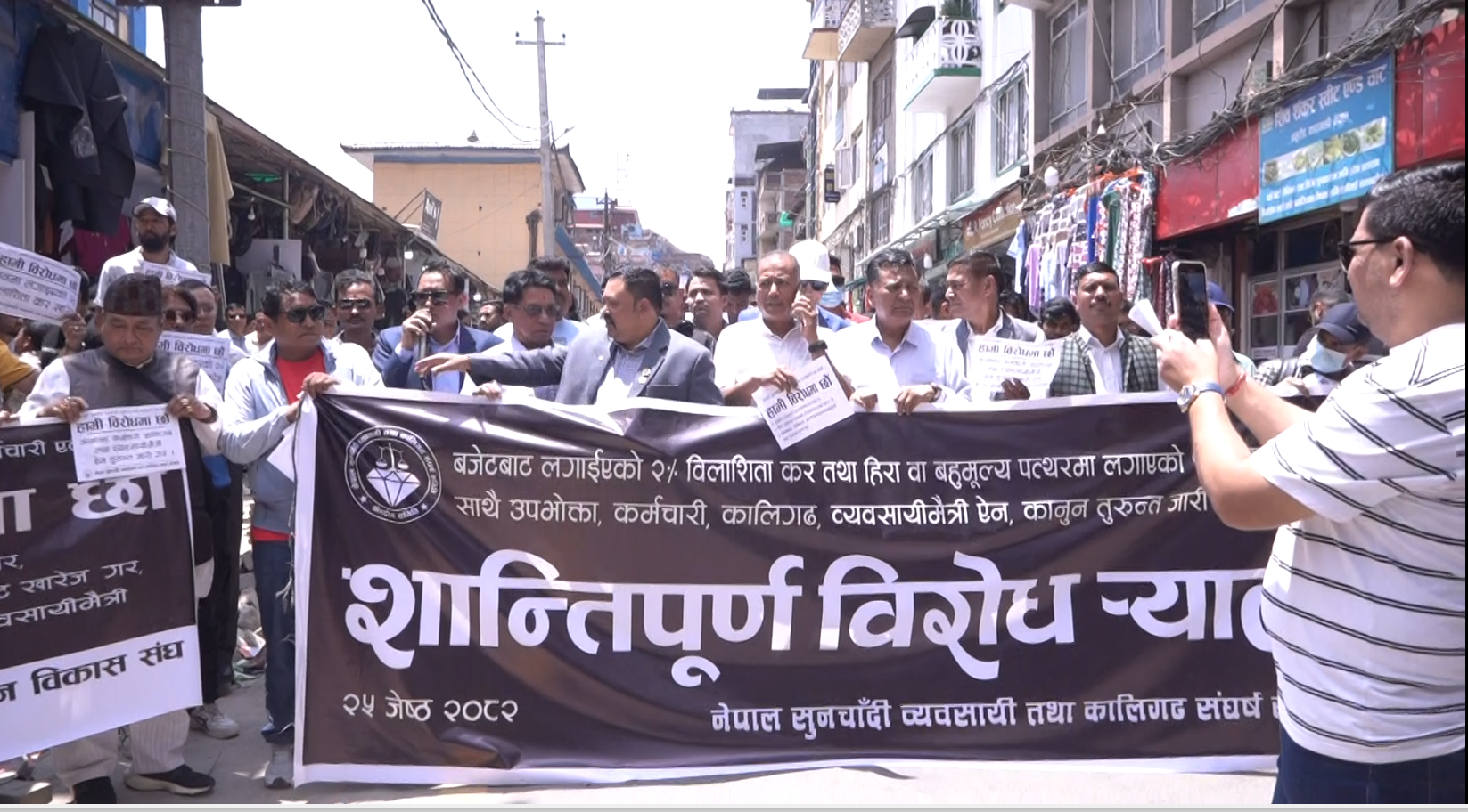 काठमाडौं । सरकारले सुनचाँदी र हिरा लगायतका बहुमूल्य गरगहनामा विलासिता कर र भ्याट लगाउने घोषणा गरेपछि सुनचाँदी व्यवसायीहरुले त्यसको खारेजीको माग गर्दै व्यवसाय नै बन्द गरेर आन्दोलनमा होमिने चेतावनी दिएका छन् । नेपाल सुनचाँदी रत्न तथा आभुषण व्यवसायी संघ र सुनचाँदी व्यवसायी संघले बुधबार संयुक्त प्र�. . .