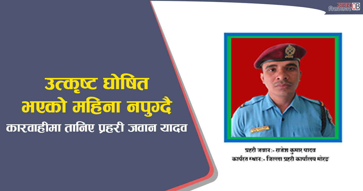 विराटनगर । प्रदेश प्रहरी कार्यालयद्वारा जेठ महिनामा उत्कृष्ट प्रहरीको रुपमा सम्मान गरिएका प्रहरी जवान राजेश यादव ,सम्मानित भएको महिना नपुग्दै कारवाहीमा तानिएका छन् । १ नम्बर प्रदेश प्रहरी कार्यालय विराटनगर रानीमा उनको उत्कृष्ट विवरणसहितको फ्लेक्स झिक्न नपाउँदै यादव कारवाहीमा त्यहि कार्यालय तान�. . .