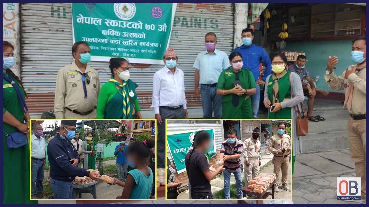 नेपाल स्काउटको ७०औ वार्षिकोत्सवको उपलक्ष्यमा विराटनगर महानगर स्काउट तदर्थ समितीले ३ चरणमा कार्यक्रम आयोजना गर्ने भएको छ । सो अनुसार आज पहिलो चरणको पहिलो दिनको कार्यक्रम अन्तर्गत तदर्थ समितिले विराटनगर महानगरपालिकाको ३ वडाहरुमा बिहानको खाजा स्वरुप पाउरोटी र पानी वितरण गरेको छ । पहिलो चरणको कार्यक�. . .