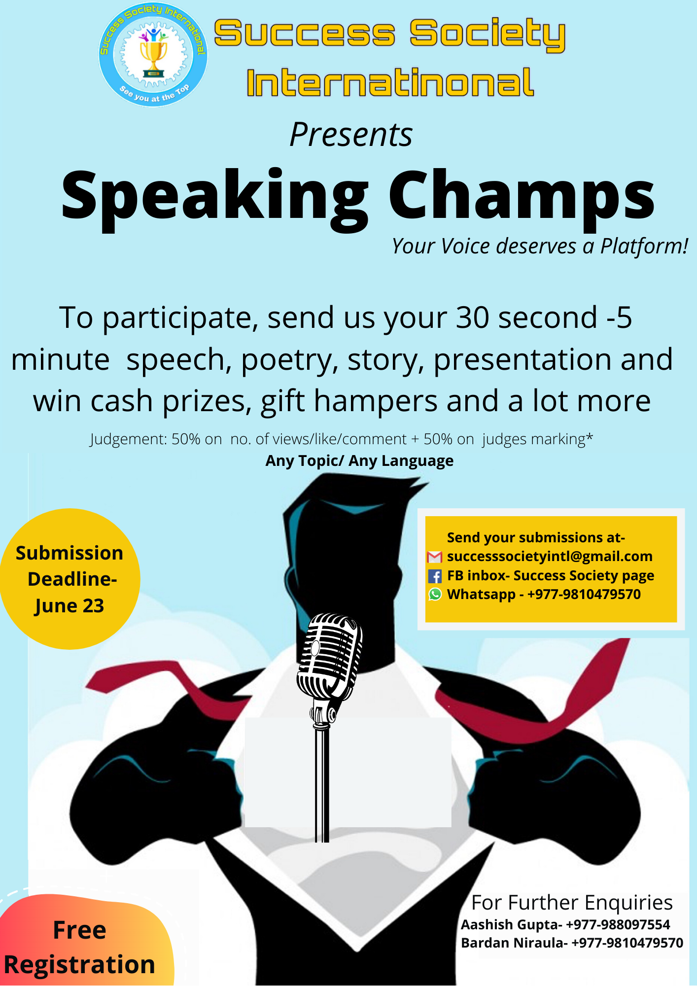 विराटनगर असार ३, सक्सेक्स सोसाइटी इन्टरनेशनलको आयोजनामा युवाहरुको लागि स्पिकिङ च्याम्स कार्यक्रम आयोजना गर्ने भएको छ । ३० देखि ५ मिनेटसम्मको भिडियो बनाई कविता, कथा, भाषण लगायतका सामग्री पठाएर प्रतियोगितामा सहभागी हुन सकिने संस्थाका प्रमुख कार्यकारी वैभव नाहटाले बताए । कुनैपनि विषय र भाषामा उक्. . .
