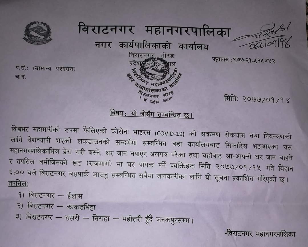 विराटनगर महानगरपालिकाले विराटनगरमा लकडाउनले समस्या भएका विद्यार्थी तथा अन्यलाई आफ्नो गन्तव्यमा पुर्याउन आज गाडीमा हालेर पठाएको छ । महानगरपालिकाले आज विराटनगरबाट धनुषा, सिरहा, सप्तरी, इलाम र झापा जान इच्छुक सम्बन्धित वडामा नाम लेखाएका नागरिकलाई विहान विराटनगर बसपार्कबाट आफ्नो गन्तव्यमा पुर्याए. . .