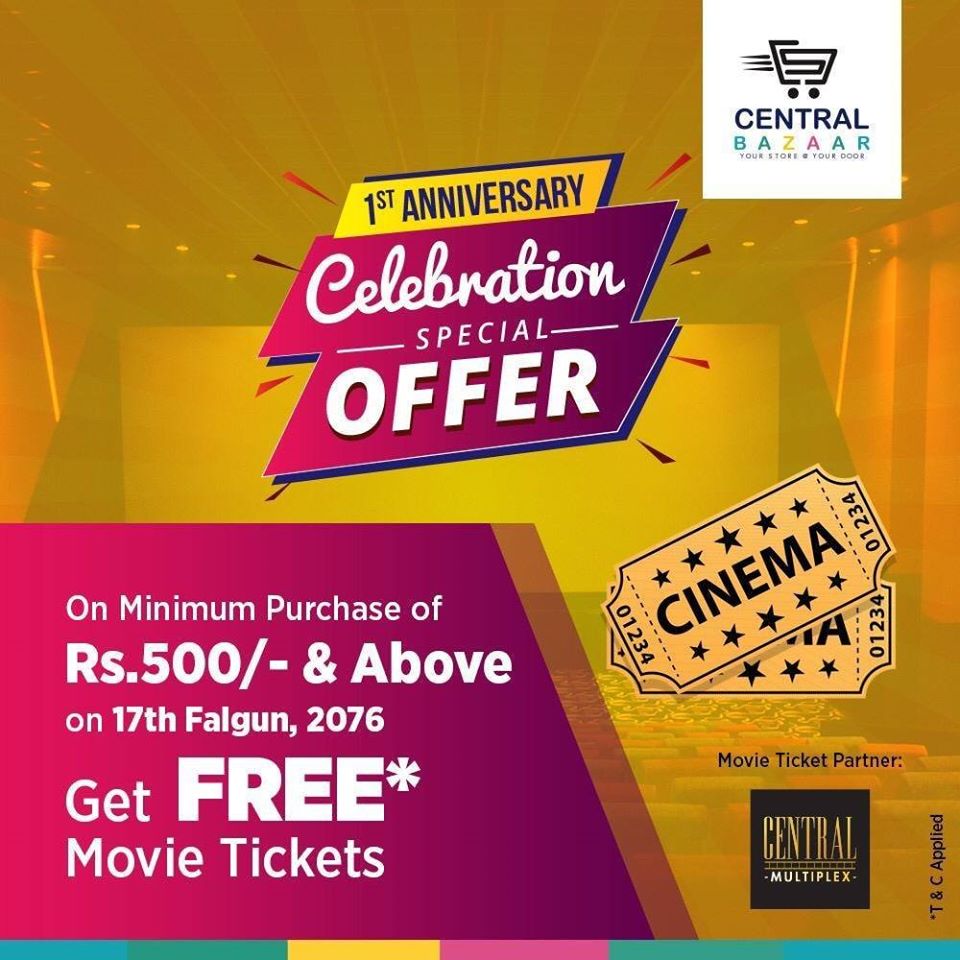 विराटनगर फाल्गुन १७ , विराटनगरको सेंत्र्रल मलले आफ्नो पहिलो वार्षिकोत्सवको अवसरमा बिभिन्न अफर लिएर आएको छ । सेन्ट्रल मलमा आज अर्थात् फाल्ग्गुन १७ गते कुनैपनि सामान ५ सय बढीको खरिद गरेको ग्राहकले सेन्ट्रल मल्टिप्लेक्सको एउटा फिल्मको टिकट निशुल्क पाउने छन् । कुनैपनि समान ५०० बढीको खरिदमा यो अफर लागु . . .