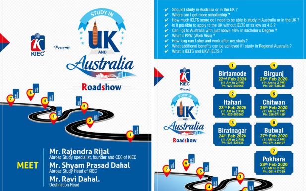 विराटनगर फाल्गुन ४, अस्ट्रेलिया तथा बेलायत पढ्न जान इच्छुक बिद्यार्थीको लागि विराटनगरमा एकदिने रोड शो सेसन हुने भएको छ । केआईइसीको आयोजनामा बिद्यार्थीहरुको लागि फाल्गुन १२ गते विराटनगरमा उक्त कार्यक्रम हुनेछ । उक्त सेसनमा बिद्यार्थीहरुलाई बेलायत तथा अस्ट्रेलिया समन्धी बिभिन्न कार्यक्रम गरिने . . .