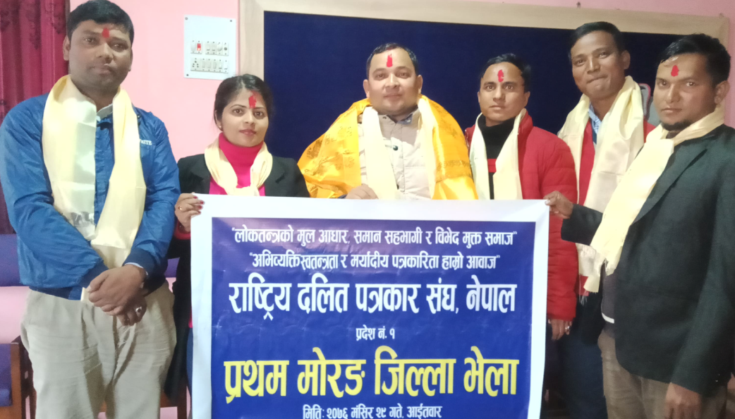 विराटनगर । राष्ट्रिय दलित पत्रकार सघ नेपाल मोरङको अध्यक्षमा पत्रकार किशोर विश्वकर्मा सर्वसम्मत चयन भएका छन् । मोरङमा क्रियाशिल दलित समुदायका पत्रकारहरुको विराटनगरमा आईतबार सम्पन्न प्रथम जिल्ला भेलाले विश्वकर्मालाई सर्वसम्मत अध्यक्षमा चयन गर्दै ११ सदस्यीय कार्यसमिति चयन गरेको हो । नेपाल पत्रका. . .