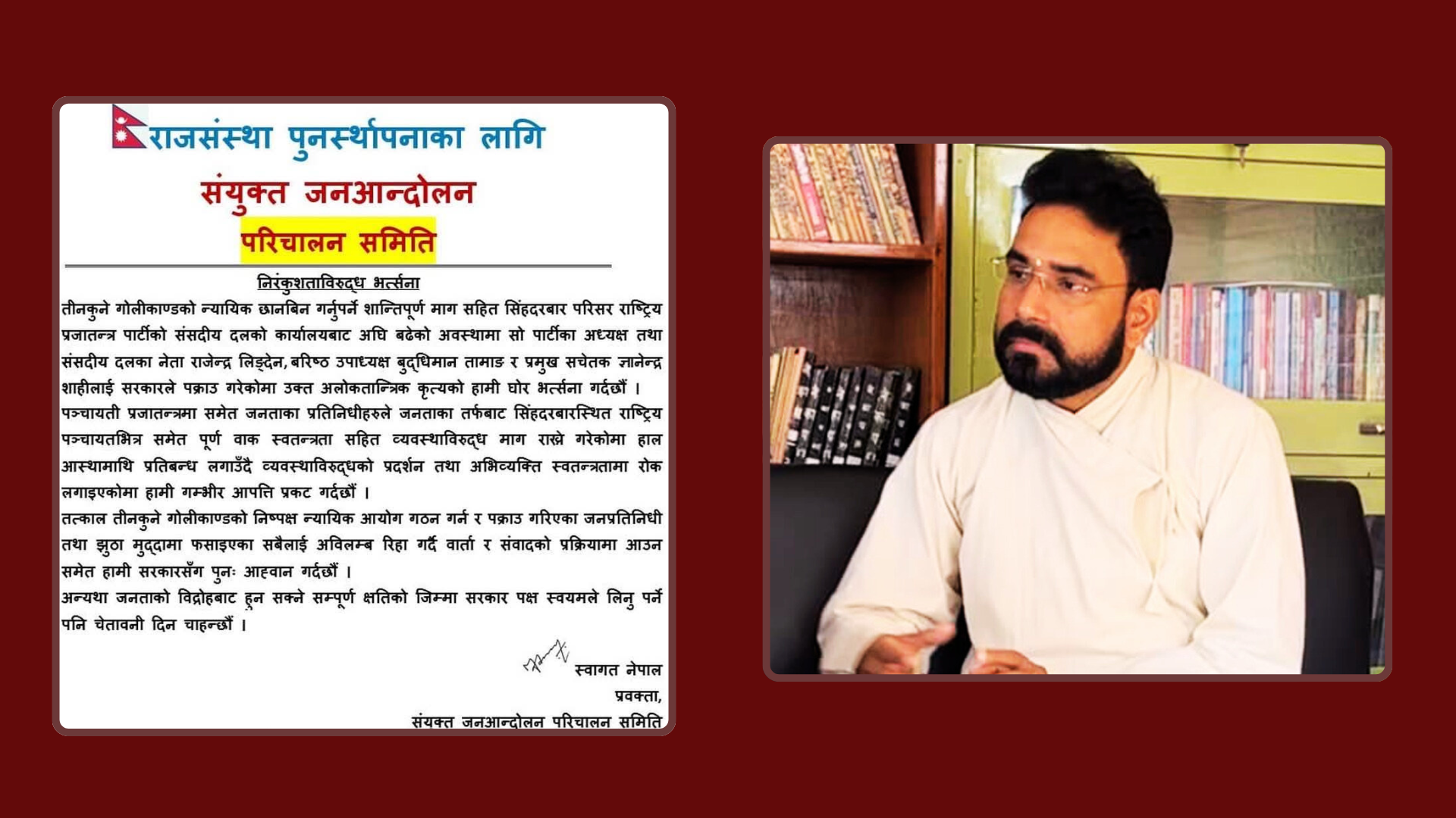 काठमाडौं । राप्रपाको आइतबारको प्रदर्शनीको क्रममा सिंहदरबार परिसरबाट पार्टीका अध्यक्ष राजेन्द्र लिङ्देन, बरिष्ठ उपाध्यक्ष बुद्धिमान तामाङ र प्रमुख सचेतक ज्ञानेन्द्र शाहीलाई सरकारले पक्राउ गरेकोमा संयुक्त जनआन्दोलन परिचालन समितिले भत्र्सना गरेको छ । समितिले आइतवार दिउँसो विज्ञप्ति जारी गर्दै �. . .