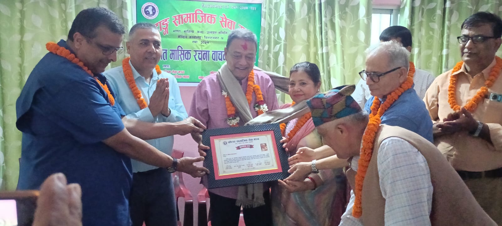 विराटनगर । खोटाङ सामाजिक सेवा मञ्चले वरिष्ठ कवि डा. विमल कोइरालालाई सम्मान गरेको छ । साढे चार दकदेखि नेपाली साहित्यमा सक्रिय कोइरालालाई शनिबार विराटनगरमा आयोजित कार्यक्रममा मञ्चले सम्मान गरेको हो । कार्यक्रमका प्रमुख अतिथिसमेत रहनुभएका विराटनगर महानगरपालिकाका मेयर नागेश कोइराला, मोरङका प्रमु�. . .