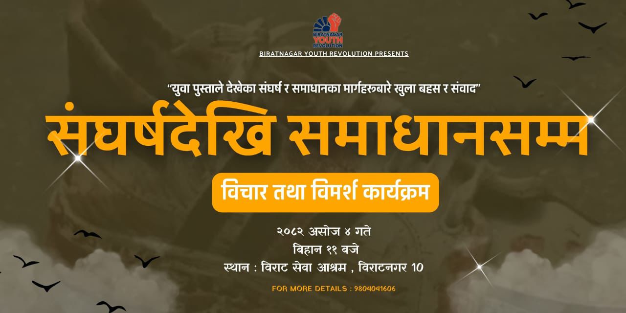 विराटनगर, असोज ३ , देशका समसामयिक विषय र सम्बन्धित निकायहरूको कामको निगरानी तथा पारदर्शिताबारे छलफल गर्न “संघर्षदेखि समाधानसम्म” नामक अन्तरक्रिया कार्यक्रम शनिबार विराटनगरमा आयोजना हुने भएको छ। कार्यक्रम यही असोज ४ गते बिहान ११ बजे विराट सेवा आश्रम, विराटनगर–१० मा हुने आयोजकहरूले जानकारी दिएका छन�. . .