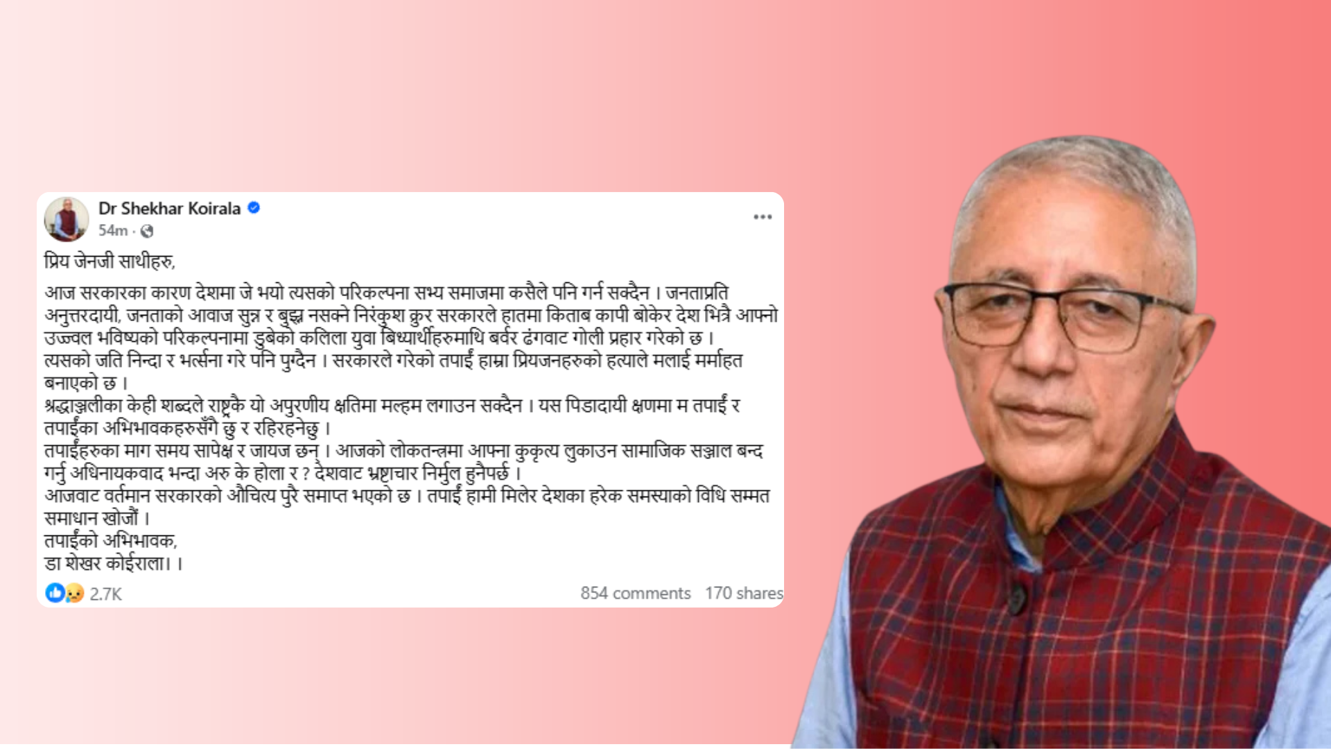 काठमाडौं । नेपाली कांग्रेसका नेता डा. शेखर कोइरालाले सरकारको औचित्य पुरै समाप्त भएको बताएका छन् । समाजिक सञ्जालमार्फत जेनजीहरुलाई पत्र लेख्दै उनले आन्दोलनमा आफ्नो साथ रहेको पनि दिएका छन् । कलिला युवा विद्यार्थीहरुमाथि बर्वर ढंगबाट गोली प्रहार गरेकोमा उनले दुः व्यक्त गरे । ‘सरकारले गरेको तपाईं हाम. . .