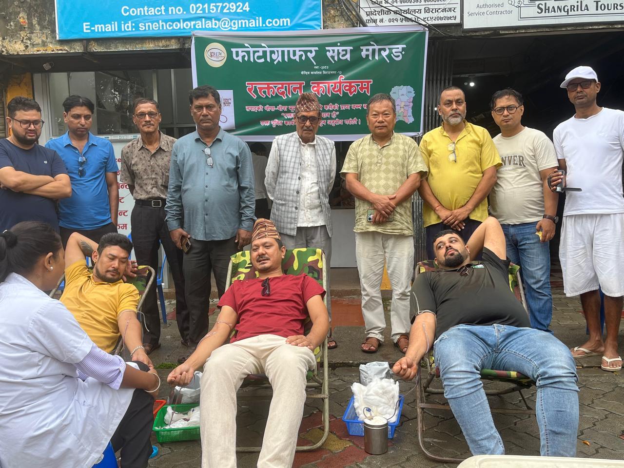 विराटनगर । फोटो ग्राफर संघ मोरङले विराटनगरमा खुल्ल रक्तदान कार्यक्रमको आयोजना गरेको छ । महेन्द्र चोकमा शुक्रबार विहान आयोजना गरेको रक्तदान कार्यक्रममा ३१ पिन्ट रगत संकलन भएको संघका मोरङ अध्यक्ष पुरन राईले जानकानरी दिए । रक्तदाता सबैलाई संघका अध्यक्ष राईले प्रशंसा पत्र प्रदान गरे । रक्तदान कार. . .