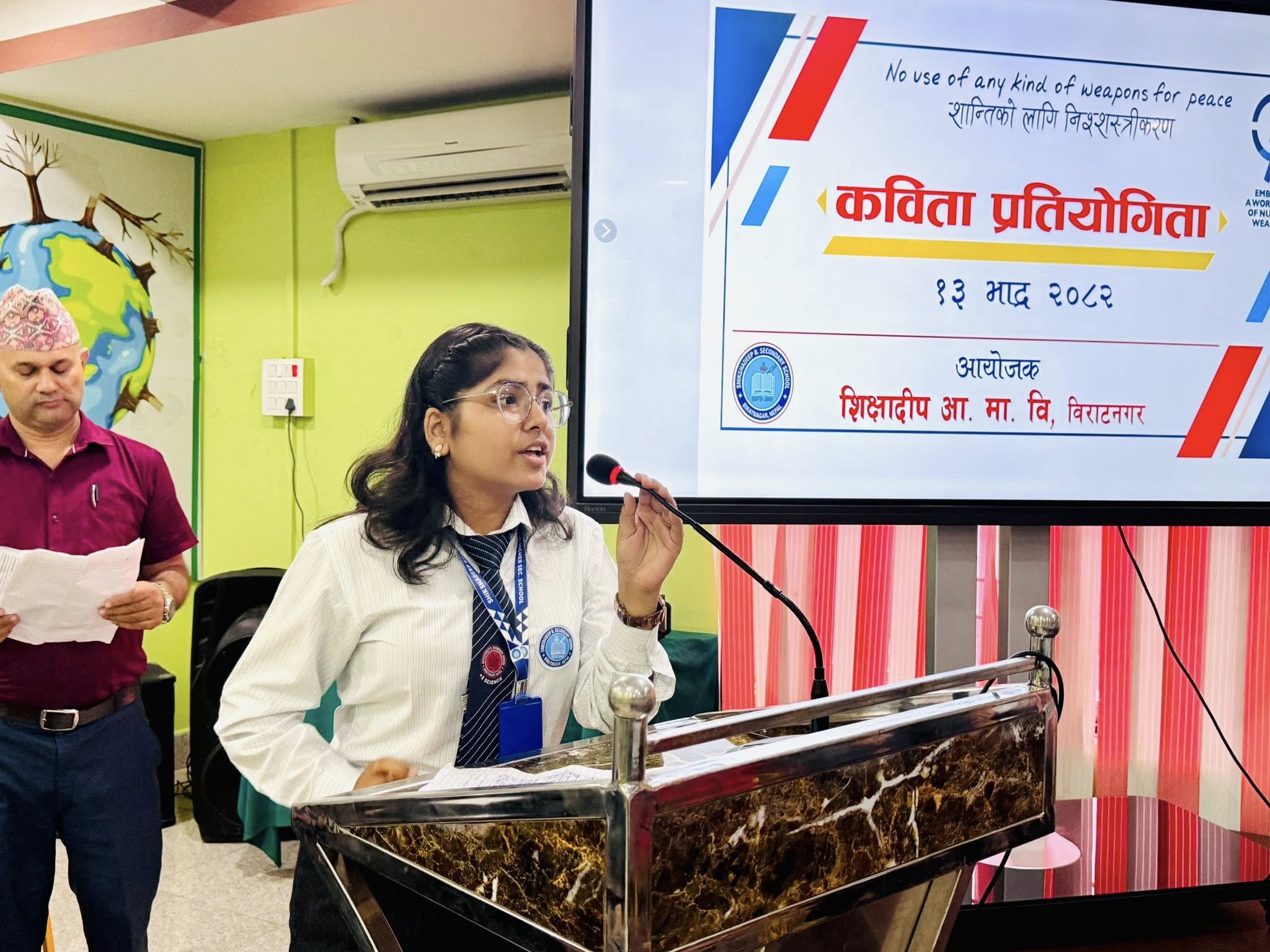 विराटनगर । विराटनगर ९ मा रहेको शिक्षादीप कलेजले यस वर्ष पनि ‘शान्तिको लागि निश्शस्त्रीकरण’ विषयमा एक महत्वपूर्ण कविता प्रतियोगिता सफलतापूर्वक सम्पन्न गरेको छ । आणविक हतियार परीक्षण विरुद्धको अन्तर्राष्ट्रिय दिवस, अगस्ट २९ को अवसर पारेर आयोजित यस प्रतियोगिताले विद्यार्थीहरूमा आणविक हतियारको विन�. . .