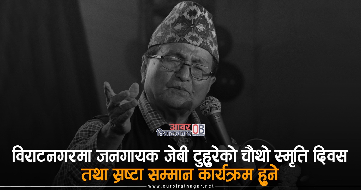 विराटनगर भाद्र ४ , जनगायक जेबी टुहुरेको चौथो स्मृति दिवस तथा स्रष्टा सम्मान कार्यक्रम आगामी भाद्र १४ गते शनिबार दिउँसो २ बजे विराटनगरमा हुने भएको छ। कार्यक्रम विराटनगर–५ स्थित एभरेस्ट सेकेन्डरी स्कुलमा हुनेछ। जेबी टुहुरे फाउन्डेसनको आयोजनामा हुने कार्यक्रममा स्मरण सभासँगै स्रष्टा सम्मानको कार्य. . .
