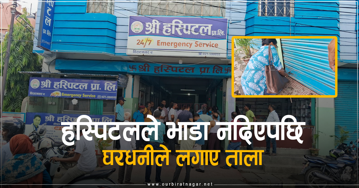 विराटनगर । विराटनगर महानगरपालीका वडा नम्बर ९ मा रहेको श्री हस्पिटलले लामो समयदेखी घर वहालको भुक्तानी नदिएपछि घर धनीेले हस्पिटलमा ताला लगाएका छन् । घरधनी सुष्मा सिंहले अस्पताल संचालक सुनिल कुमार यादवलाई पटक पटक घर वहालको भाडा भुक्तानी माग्दा नदिएपछि वाध्य भएर शुक्रबार ताला लगाएका हुन् । मासिक २ ला�. . .