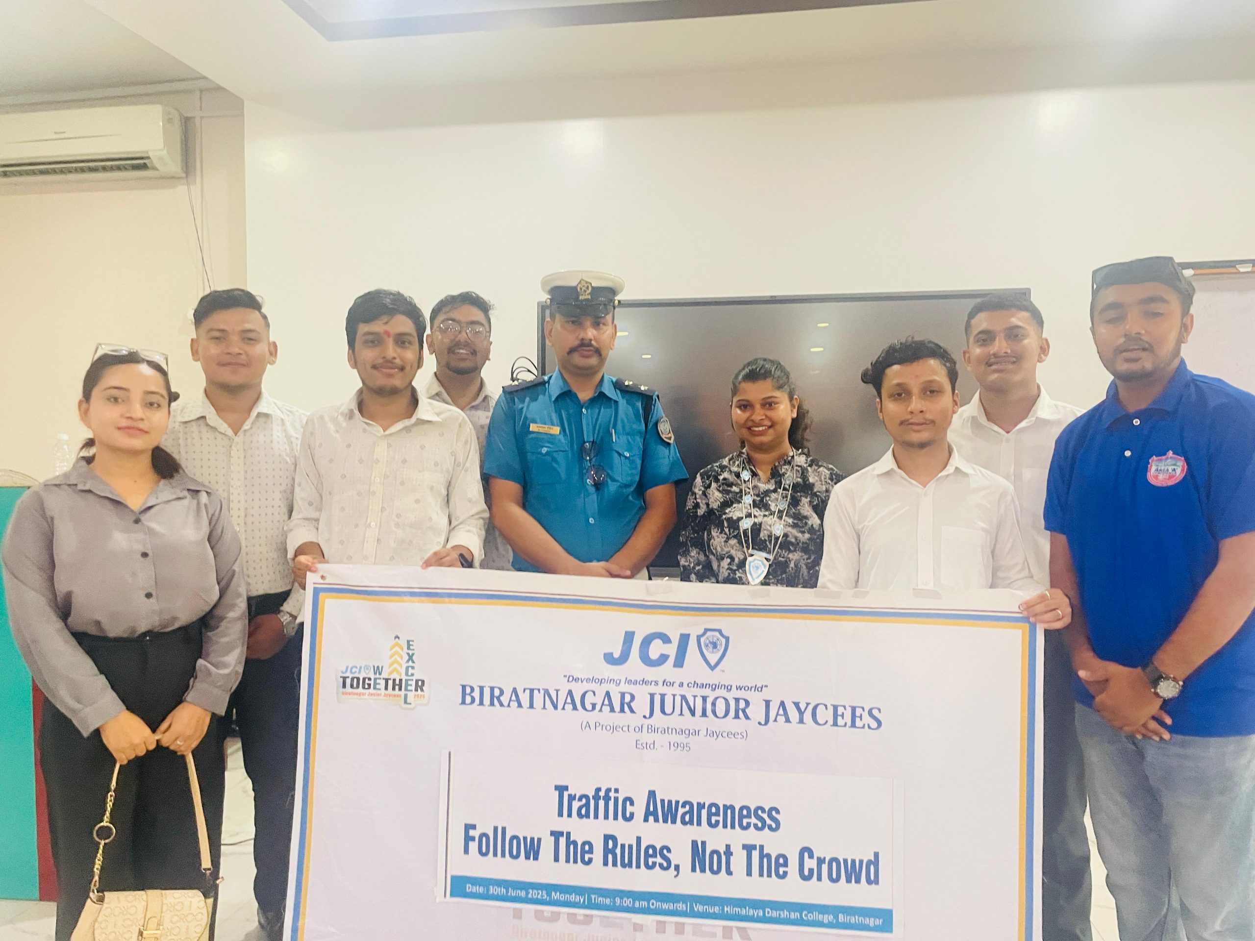 बिराटनगर, असार १६ – बिराटनगर जुनियर जेसीजको आयोजनामा सोमबार हिमालयन दर्शन कलेज परिसरमा "ट्राफिक सचेतना : भीड होइन, नियम पछ्याऔं" भन्ने नारासहित एकदिने विशेष कार्यक्रम सफलतापूर्वक सम्पन्न भएको छ। कार्यक्रमको नेतृत्व जुनियर जेसी आयुषा खतीवडाले गर्नुभएको थियो। कार्यक्रममा जिल्ला ट्राफिक प्रहरी कार्. . .